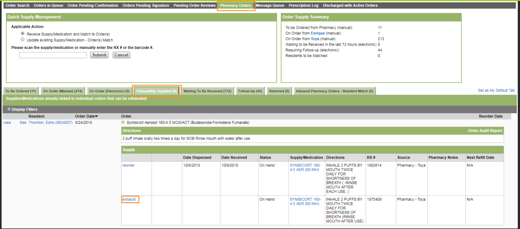 - Clinical > Orders > Pharmacy Orders > Exhaustible Supplies.