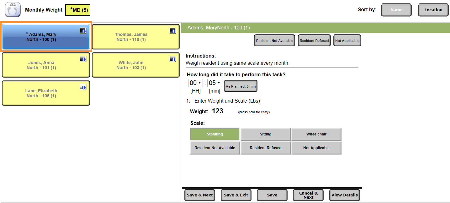 Click Save & Next. You see the next resident in the list, indicated in blue.