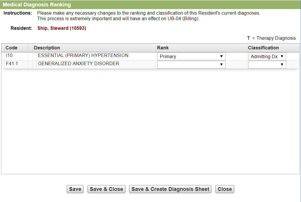 Rank - Select option. Designates the order the medical diagnoses appear on the Medical Diagnosis list.