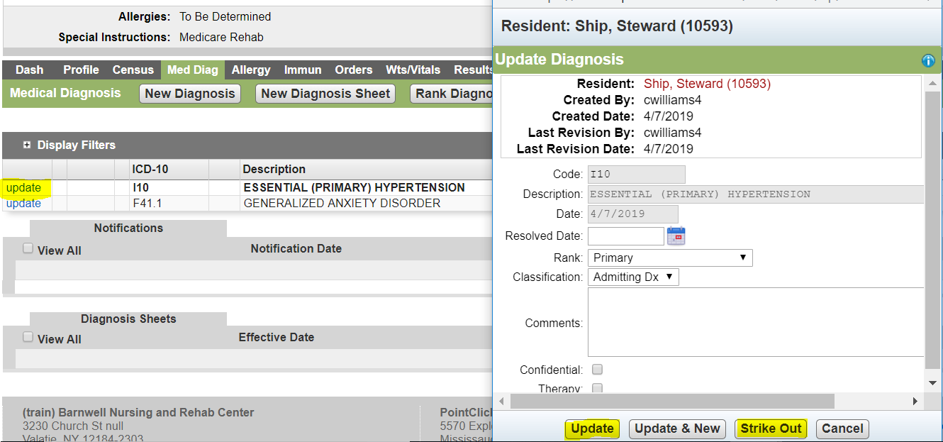 - You can also Update OR Strikeout Medical Diagnosis by selecting on the update link